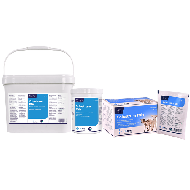 - Dessutom har nödvändiga vitaminer och spårämnen lagts till. Topro Kolostrum Mix är producerad med målet att så fullständigt som möjligt komplettera kolostrum från moderdjuret.